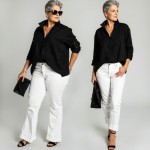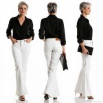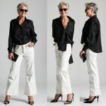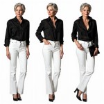 imagine a beautiful 40-year-old stylish woman who is size 8 and highly stylish from Vogue. She has short sassy gray hair. she is wearing fitted white denim jeans with slight flared hem. she is wearing a black long sleeve top with black polo collar and a deep V. She is wearing high heel sandals and carrying a black clutch. create some images with top tucked in and some with top shown out.