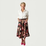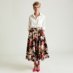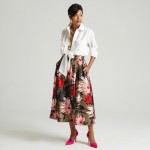 Imagine a 40-year-old highly stylish woman with modern hair styles, short. She is wearing a Dressy white pressed button-down shirt with an open collar, no pockets on the shirt, and three chunky gold chains inside the shirt. The sleeves are cuffed up to mid-forearm. She is wearing a full skirt with a trendy floral print in khaki, black, red, light pink and white . Skirt hits at ankle length and hot pink 3" heels with a closed toe but open back. Her hands are in her pockets. No earrings. show full body image.