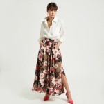 Stylish Woman in White Shirt, Floral Skirt and Gold Chains Full Body