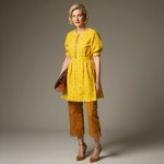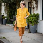 Create an image of a stylish woman over 40 with short blonde hair, wearing makeup and bold red lipstick. She is dressed in a mustard yellow, short, full eyelet cotton dress featuring a jewel neckline with an inverted pleat at the center. The hem of the dress is 2 inches wide and falls 5 inches above the knee. The sleeves are bracelet-length raglan puff sleeves, covering part of her forearm. She wears the dress layered over fitted tan cotton capri pants. Her accessories include tan high-heeled sandals and a large tan clutch bag.