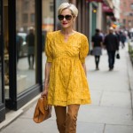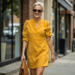 Stylish Woman Over 40 Wearing Yellow Dress and Tan Accessories