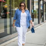 Plus Size Woman with Sunglasses Wearing White Tee and Blue Shirt
