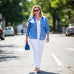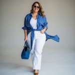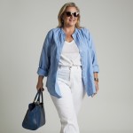 imagine a pretty 40-year-old stylish woman who is plus size 8 and pretty. she has broad shoulders and large bust. Her waist is not defined. She has no hips. .Dress her in a v neck white tee. give her a fitted blue crisp woven shirt that is buttoned all the way to bust and worn out and not tucked into her white fitted bootcut jean. she is wearing tan ballet flats, sunglasses, and blue bag in hand.