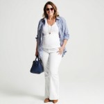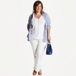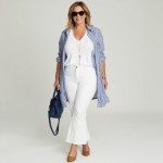 imagine a pretty 40-year-old highly stylish and fashion-able woman who is plus size 14. She has a full round belly. Her hips are narrow. Her shoulders and bust are small. she is wearing a v neck white tee and white flared leg fitted jeans to ankle. she is wearing a blue stripe shirt worn open over the vneck tee. loosely tuck tee into jeans. she is wearing 2 long chains. she is wearing tan ballet flats and carrying a blue bag in her hand. show full body image.