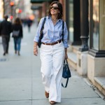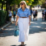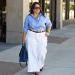 image a pretty 40 year old highly stylish and fashion able women who is a pear shape . she is PLUS size 18. Her hips are wider than bust. Her waist is defined. Her shoulders are narrow. She is wearing white high waisted jeans that are wide leg to her ankle with a pressed crease, brown ballet flats, blue handbag with handles, sunglasses and a blue oxford button-down shirt tucked in with a brown belt. She is wearing 3 thick chains around neck.