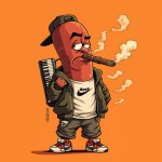 Cartoon Sausage Character in Streetwear with Music Keyboard and Cigar
