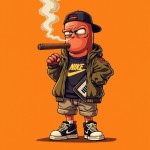A cool, cartoon-style sausage character standing confidently against an orange background. The sausage is wearing streetwear: a Nike t-shirt, a backwards cap, a baggy jacket, shorts, and stylish sneakers. It holds a portable music keyboard under one arm and smokes a thick cigar, with smoke swirling around in stylized patterns. The expression is tough and unimpressed, with droopy eyes and a swaggering pose. The art style is bold, detailed, and urban with hip-hop vibes and a touch of humor.