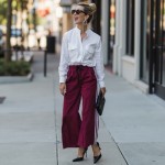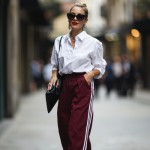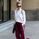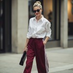 Create a 40-year-old woman who is stylish, with her hair in a twist knot. She is wearing sunglasses, makeup, and lipstick. She is dressed in a white button-down shirt, partially tucked into Adidas maroon track pants with three stripes down the side leg with a wide leg opening. She is wearing pointy-toe pumps and a black leather clutch bag. silver thick earrings.
