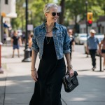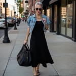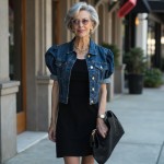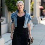 Imagine a 40-year-old woman who is highly stylish and very pretty. Hair is short silver gray and stylish. she is wearing a black jersey knit fit and flare dress that has a scoop neck, it is sleeveless and has a long full skirt. she is wearing a medium wash short-sleeved denim jacket that has a 1" cuff at her elbow and puffy sleeves with a gathered cap and it is worn over the dress. she has black thong sandals and oversized black straw clutch with brass zipper. give her gold thick chains at neck.