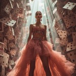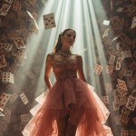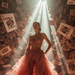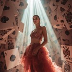 Without changing my facial features and face. remove my earrings. Created me the same page on attachment 100% unchanged. A stylish woman wearing a vibrant dusty rose ensemble o0 strapless embroidered crop top with intricate beadwork and a matching high-low skirt made of multiple layers of sheer flowing tulle or chiffon creating a ruffled oluminous effect. stands confidently pose like a model in a surreal, towering environment made entirely of giant playing queen cards. The cards are stacked in massive columns reaching toward the ceiling, with some floating and tumbling in mid-air. Beams of dramatic light stream down from above, illuminating the woman and casting dynamic shadows through the layers of cards. Ultra-detailed, photorealistic lighting, depth of field, 8K quality.