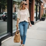 Imagine a 40-year-old woman who is highly stylish and very pretty. Hair is shoulder-length and blonde. She is wearing straight slim jeans.. Wash is a light wash denim. She is wearing a cream color crochet pullover sweater that is short. The sleeves are short. She is wearing brown high-heeled sandals and carrying a large straw tote bag. She has a large gold bangle bracelet.