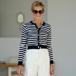 create 40 year old stylish woman wearing white white full wide leg trousers, brown classic boat shoes, a tight fitted navy and white nautical thin stripe boat neck cardigan with big gold buttons. Give her 2 chunky gold chains and one pearl strand her hair should short and sassy and she is wearing sunglasses.