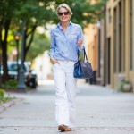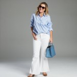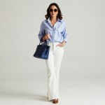 imagine a pretty 40-year-old highly stylish and fashion-able woman who is an inverted triangle shape with broad shoulders and large bust, but very narrow waist and narrow hips. She is size 8. She is wearing white high-waisted jeans with a WIDE boot cut flare reaching to her ankle. She has on brown ballet flats, blue handbag with handles, sunglasses and a blue oxford button-down Striped shirt worn buttoned to bust and shown out over the jeans. Do Not tuck in shirt. Sleeves are cuffed up. Show full body shot.