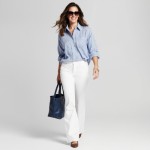 Full Body Shot of Stylish Woman with Inverted Triangle Shape in White Jeans and Striped Oxford Shirt