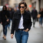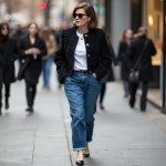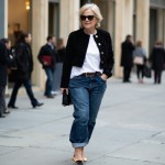 Stylish 40 Year Old Woman Wearing Cropped Chanel-Style Jacket and Jeans in Street Scene