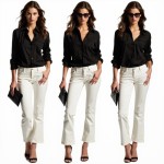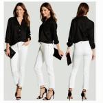 imagine a beautiful 40-year-old stylish woman who is size 8 and highly stylish from Vogue. she is wearing fitted white denim jeans with slight flared hem. she is wearing a black long sleeve top with black polo collar and a deep V. She is wearing high heel sandals and carrying a black clutch. create some images with top tucked in and some with top shown out.
