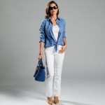 Stylish 40-Year-Old Woman in White Tee and Blue Shirt with Accessories