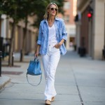 imagine a pretty 40-year-old stylish woman who is size 8 and pretty. she has broad shoulders and large bust. Her waist is not defined. She has no hips. .Dress her in a v neck white tee. give her a fitted blue crisp woven shirt that is buttoned all the way to bust and worn out and not tucked into her white fitted bootcut jean. she is wearing tan ballet flats, sunglasses, and blue bag in hand.