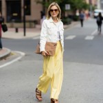 Stylish 40-Year-Old Woman with Yellow Trousers and White Denim Jacket