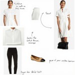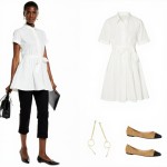 Stylish Middle-Aged Black Woman Wearing White Poplin Neck Shirt Mini Dress with Black Capri Pants and Ballet Flats