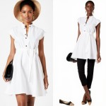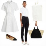 Show the full image from head to toe. Use this garment from Amazon: Norma Kamali Women's Super Button-Front Neck Shirt Flared Mini Dress in white poplin, featuring a self-sash and short, sleeves for coverage. Dress ends at 6" above knee. Hem is even. Show it on a 40-year-old black woman who is stylish with short hair. show it with black fitted capri pants and black and tan cap toe ballet flats. she is carrying a large black straw clutch bag and is wearing gold earrings.