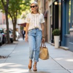 Imagine a 40-year-old woman who is highly stylish and very pretty. Hair is shoulder-length and blonde. She is wearing straight slim jeans without a cuff. Wash is a light wash denim. She is wearing a short cream-colored crochet pullover sweater. The sleeves are short. She is wearing brown high-heeled sandals and carrying a large straw tote bag. She has a large gold bangle bracelet.