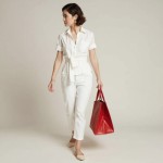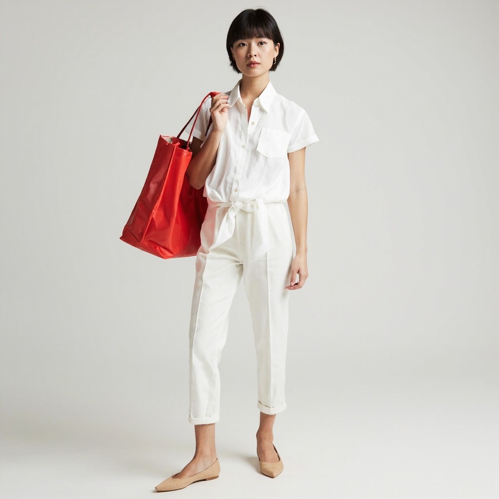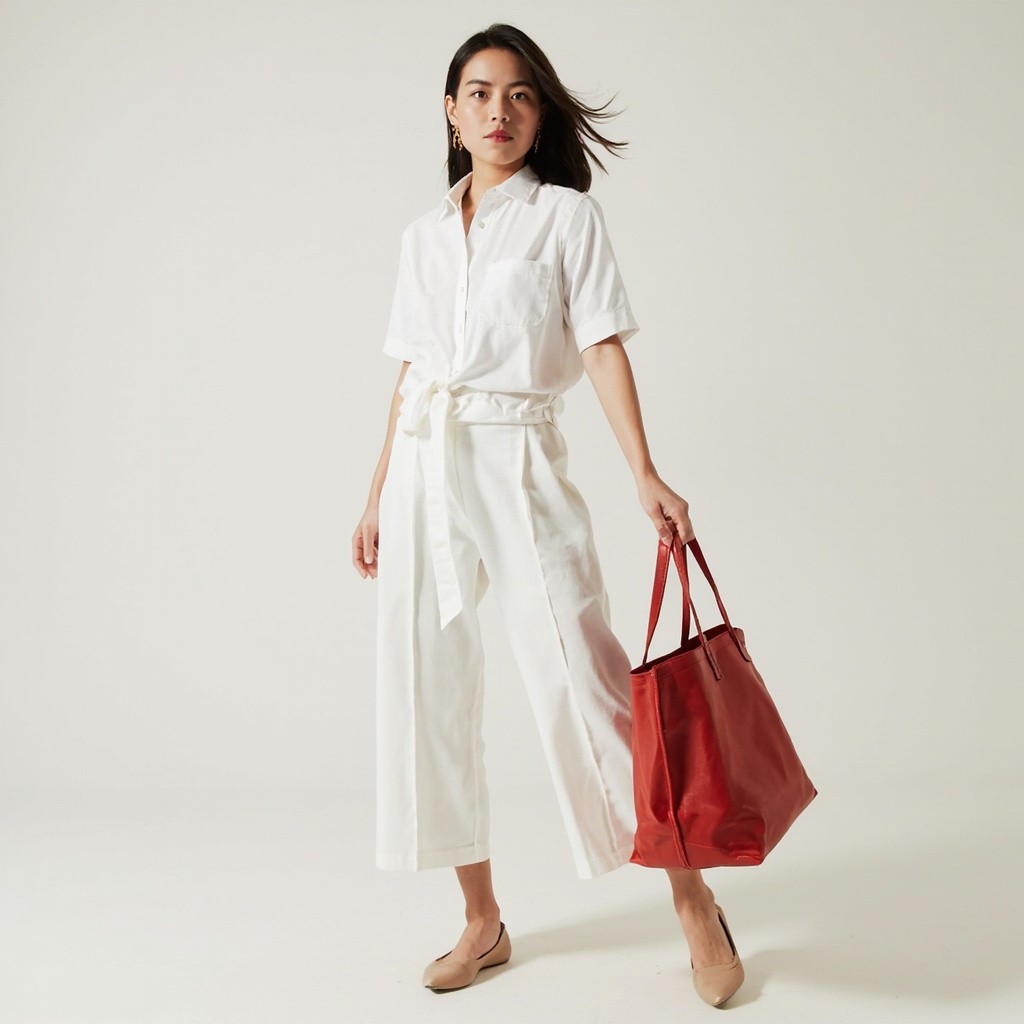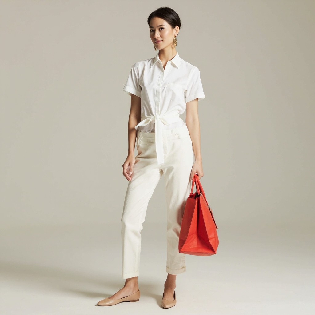 Show the full image from head to toe. Use this garment from Women's Button-Front Neck Shirt in white poplin, featuring a self-sash and short, sleeves for coverage. Show it on a 30-year-old eurasian woman who is stylish with short hair. show it with white fitted capri pants and beige ballet flats. she is carrying a giant red shopping tote and is wearing gold earrings.