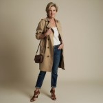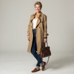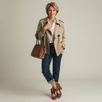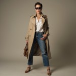 Stylish Middle-Aged Woman in Trench Coat and Jeans with Handbag