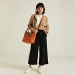 create 40 year old chic and highly stylish woman carrying a Lonchamp very small (about 5" wide) Le Piliage bag that hangs across her body on a thin 30" strap. bag should be orange with light brown flap and strap. She is wearing black wide leg track pants with white stripe down the side and an tan pullover with a white tee shirt underneath. She is wearing white nike Samba sneakers