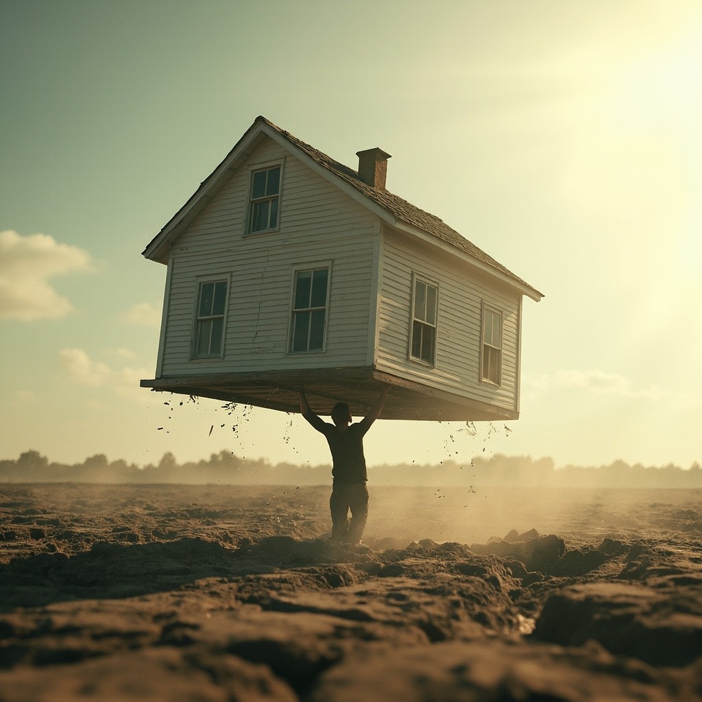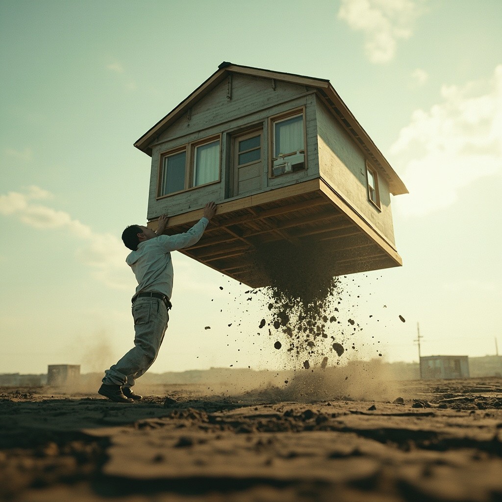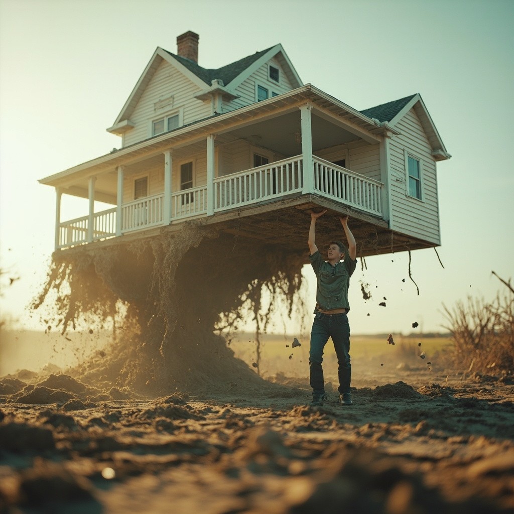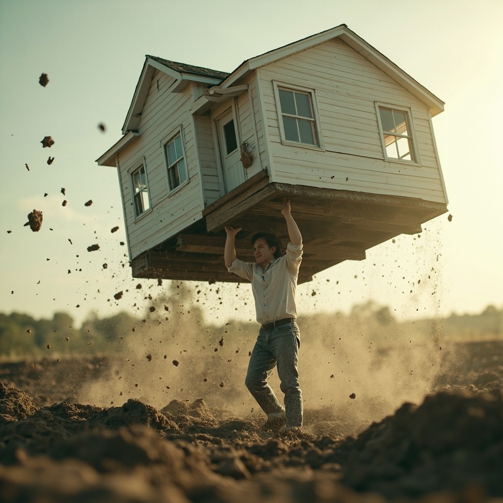 A hyper-realistic cinematic video created from my uploaded photo as the base. The same house visible in the photo remains in its original place. The subject from the photo stands beside the house. The ground shakes gently as cracks spread outward and loose soil breaks apart. With natural, realistic body motion and subtle breathing, the subject grips the base of the house with both hands and slowly lifts it from the ground. Dust and small debris fall as the house comes free, foundation and soil pieces dangling. The subject raises the house above shoulder height and begins walking forward while carrying it. Smooth physics-accurate movement, natural hair and cloth motion, soft sunlight rays, real-world shadows, and cinematic depth of field, 4K hyper-real live-action realism, no exaggerated expressions.