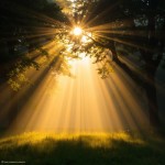 A sunburst shining brightly through the leaves of tall trees, casting strong beams of golden light across a misty, grassy clearing. The trees frame the scene, creating a natural archway of dark foliage silhouetted against the bright light. The ground is covered in lush green grass, illuminated by the streaks of sunlight, creating a hazy and ethereal atmosphere. The overall lighting is warm and dramatic, with strong contrasts between light and shadow. 16:9 aspect ratio.