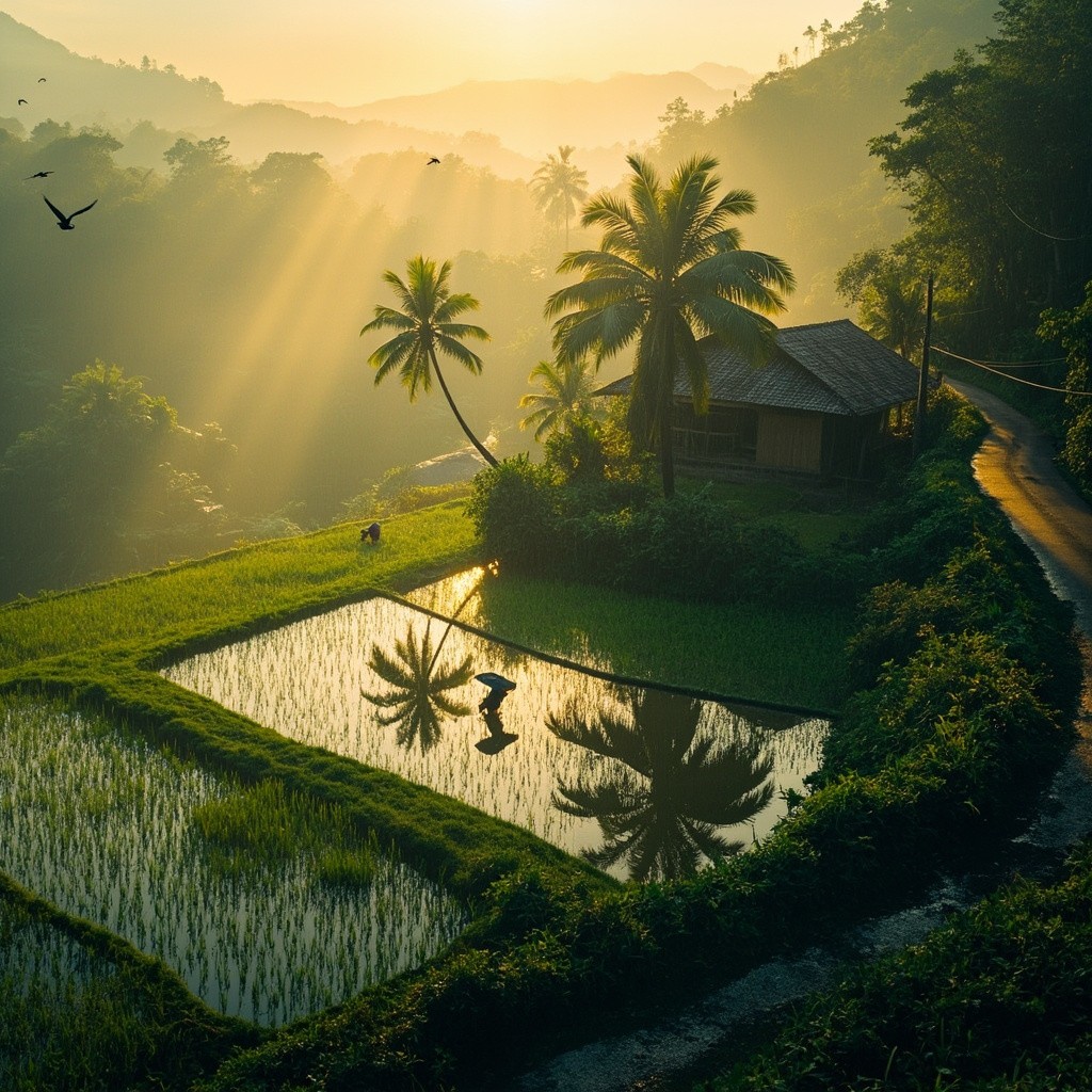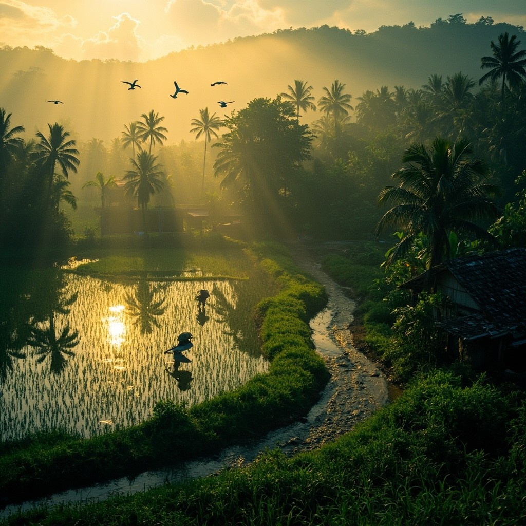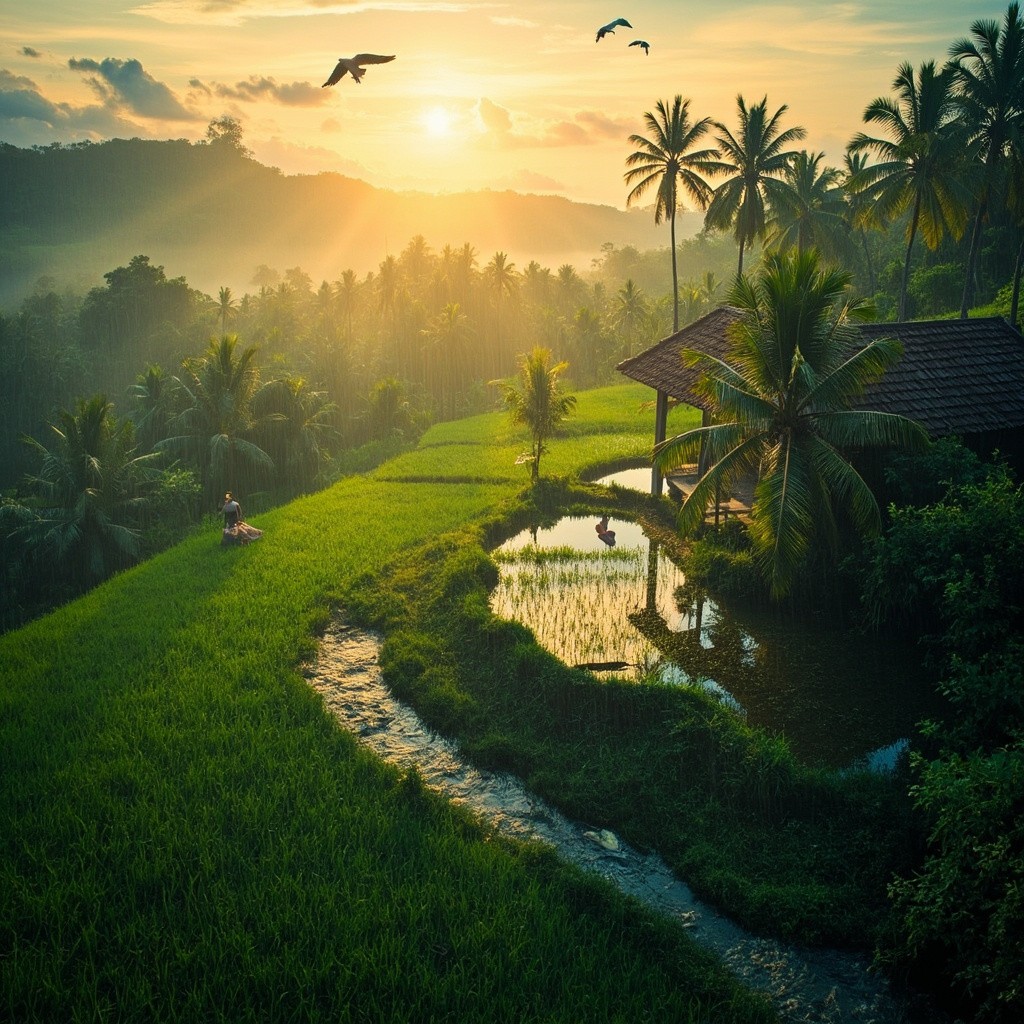 A wide top-angle drone view of a serene hillside village at sunrise, with golden sunlight breaking through mist and gentle rainfall. Birds are seen mid-flight above the landscape. Below, villagers work in lush, waterlogged paddy fields, their figures reflected in the shimmering surface. Tall coconut, arecanut, and native forest trees create a green canopy in the background. A tiled-roof house partially peeks through the trees. Small river with clear water beside the house. The terrain slopes gently, indicating the edge of a hill, and a narrow, winding rural road cuts through the landscape, slick with fresh rain. The atmosphere feels fresh, calm, and deeply connected to nature.