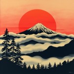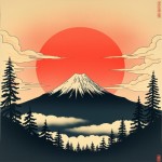 Ukiyo-e Style Mount Fuji Sunset with Pine Trees and Rolling Clouds