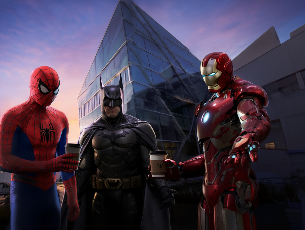 Superheroes meeting for coffee with Iron Man asking for a ride through the skies.