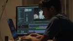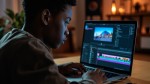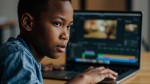 Teenage Black Boy Opening Laptop with Video Editing Screen