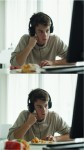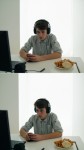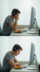 Teen Boy Sitting at Computer in Bright Room with White Walls and Fast Food Plate
