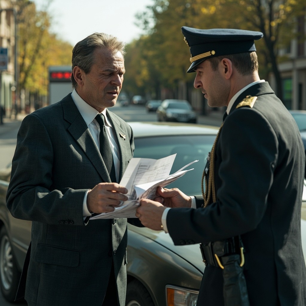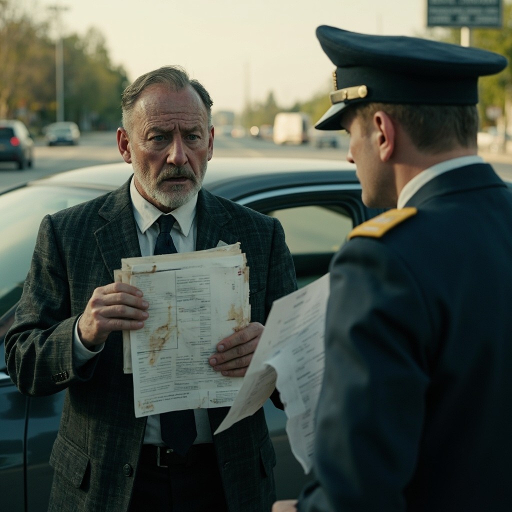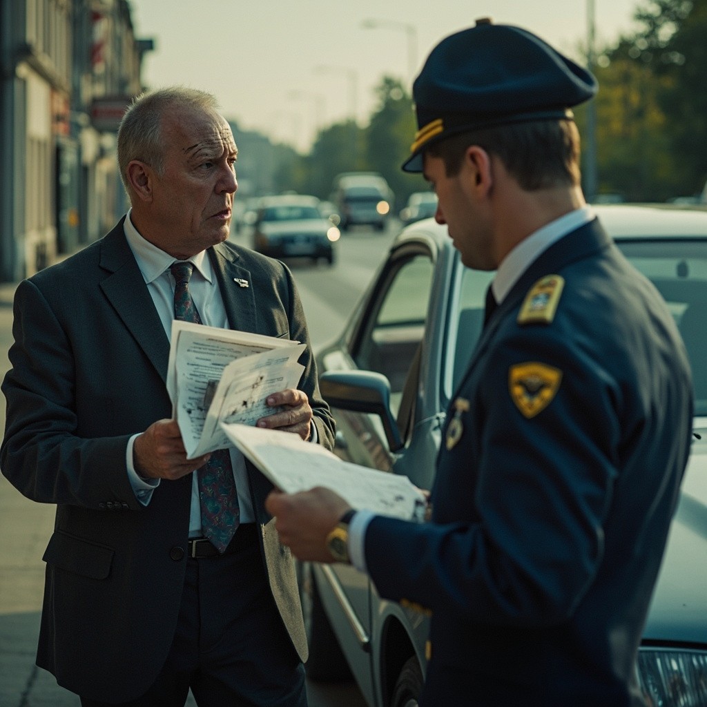 A hyper-realistic scene of a tense roadside inspection. A worried business owner stands next to his car, holding a folder with messy, incomplete documents. His facial expression shows clear anxiety and stress. Across from him stands a strict Russian traffic police officer (GAI officer), dressed in an official uniform, внимательно inspecting the documents with a serious and slightly suspicious expression. The setting is a realistic urban roadside during daytime, with natural lighting, subtle shadows, and detailed textures. The car looks slightly worn but expensive, hinting at business use. The businessman is dressed in a formal suit, slightly disheveled, with sweat on his forehead. Focus on эмоции: tension, discomfort, authority vs vulnerability. Ultra-detailed skin textures, realistic lighting, cinematic composition, depth of field, 8K resolution, sharp focus, photorealism.