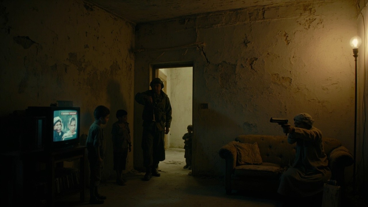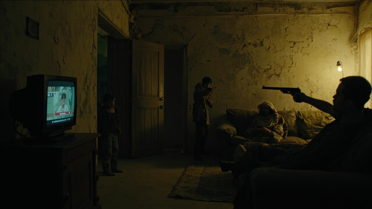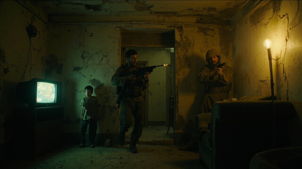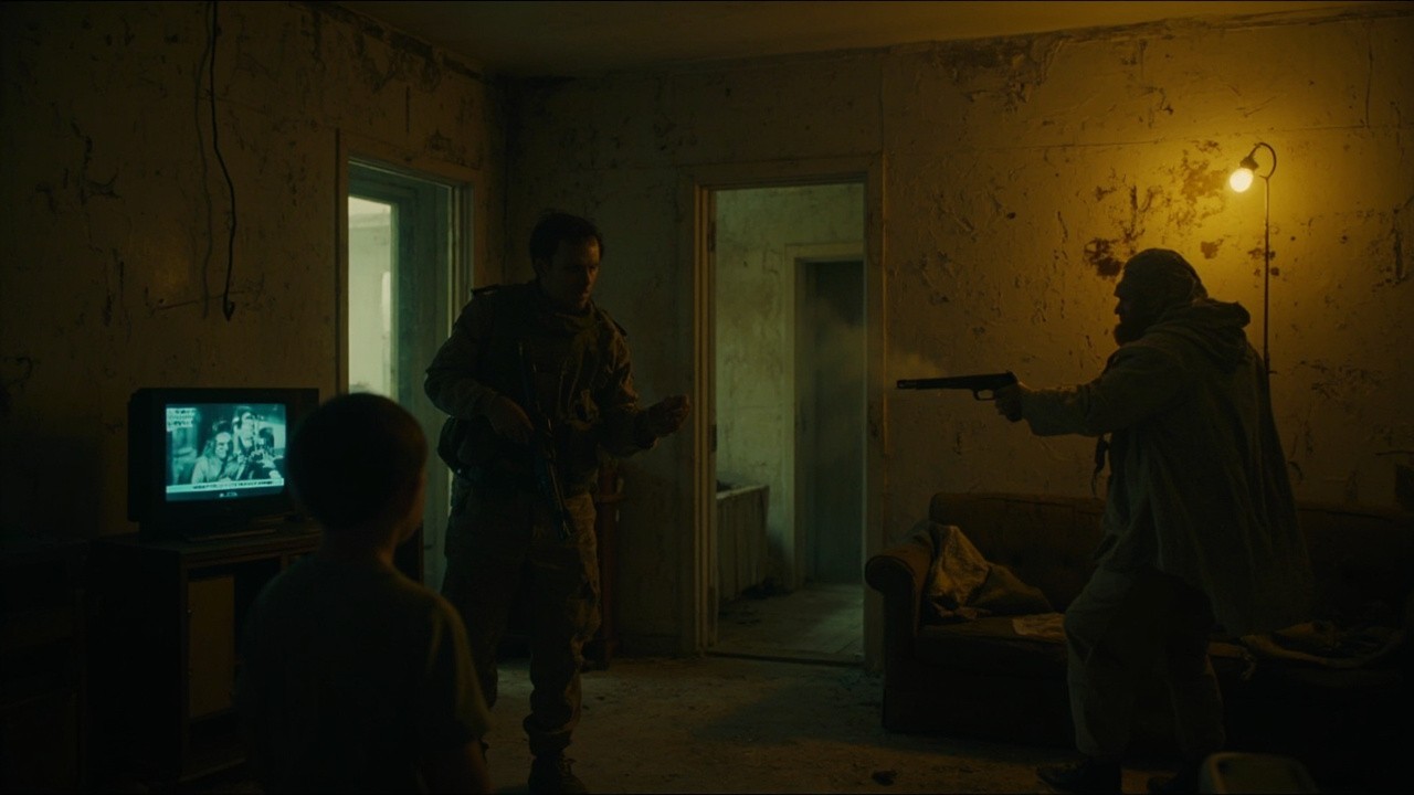 Cinematic interior of a rundown apartment, gritty and realistic. Cracked plaster walls with peeling paint and visible water stains. in the left corner of the room An old TV on a TV stand is showing an African soap opera. a young boy is standing to the right of the TV. A us soldier enter the room, looking at the young boy. From behind an old dirty sofa, An Arab man in a ma’awis robe is shooting at the soldier with a hand gun. The only light source is a bare incandescent bulb mounted on a floor lamp in the far right corner, casting harsh, directional shadows across the room. The atmosphere feels tense, intimate, and worn-down, with a sense of quiet desperation.", "style": "cinematic realism, gritty drama, high detail", "lighting": "low-key lighting, single practical light source from a floor lamp, strong shadows, warm bulb glow", "camera": "28mm lens, eye-level angle, shallow depth of field, film grain", "mood": "tense, bleak, intimate, claustrophobic", "color_palette": "muted browns, dirty yellows, desaturated blacks and grays", "environment_details": "dusty floor, chipped furniture, stained walls, minimal decor", "atmospheric_effects": "cigarette smoke haze, subtle volumetric light