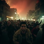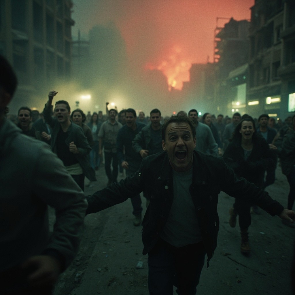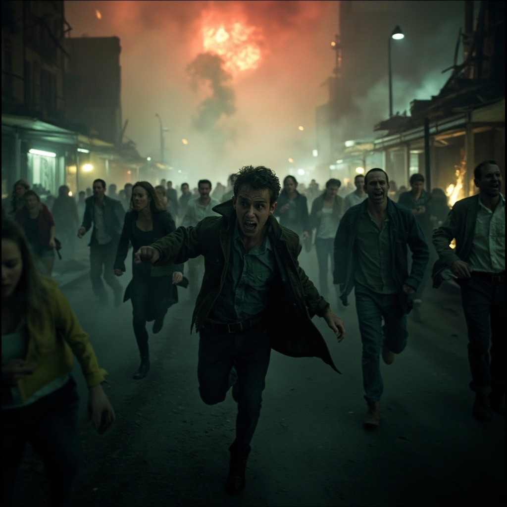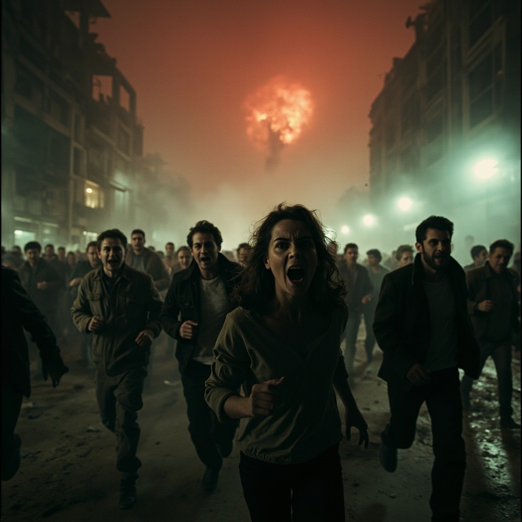 مشهد فوضوي لأناس مذعورين يركضون هاربين بحياتهم عبر بيئة ضبابية مظلمة. وجوههم تعكس الخوف واليأس وهم يفرون من قوة مميتة خفية. يخيّم الضباب والظلال على المكان، مع أضواء خافتة متذبذبة في الخلفية. تتناثر الأنقاض والمباني المدمرة في الشوارع، بينما تتوهج السماء بلون أحمر غريب. تتميز الصورة بطابع سينمائي، أشبه بأفلام الرعب، مع إضاءة درامية، وضبابية الحركة، وحبيبات فيلم عتيقة تضفي عليها جمالية قديمة وكارثية. تم تصويرها من زاوية واسعة لتجسيد حجم الذعر والحركة.