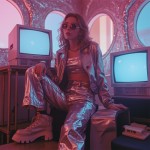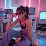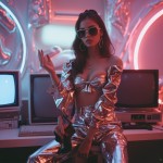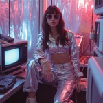 Y2K-themed fashion photoshoot with a female model wearing shiny metallic clothing, crop top and low-rise jeans, chunky accessories, tinted sunglasses, and platform shoes, set in a retro-futuristic room with silver and neon accents, old-school tech like CRT monitors and flip phones, soft pink and blue lighting, glossy textures, vaporwave aesthetic, early 2000s vibe, editorial style, high-resolution