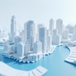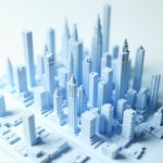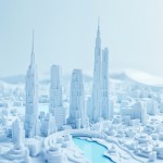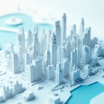 Futuristic Cityscape 3D Model in Blue and White, Aerial View