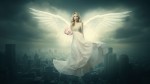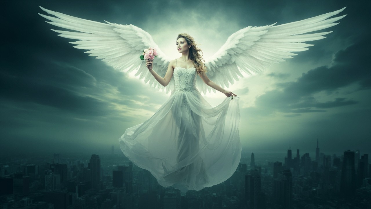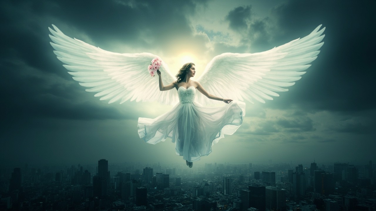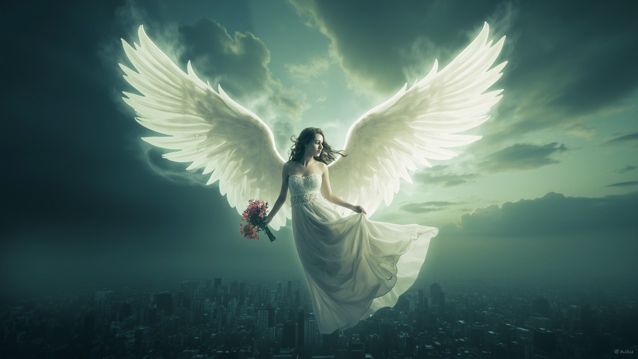 A majestic angelic figure with large, luminous white wings hovering above a sprawling cityscape under a dark, cloudy sky. The angel is dressed in a flowing, elegant white gown and holds a small bouquet of pink flowers in one hand. The scene is ethereal and surreal, with a soft glowing light emanating from the angel, creating a divine and serene atmosphere. The city below appears vast and detailed, contrasting with the heavenly presence above.