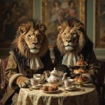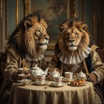 Whimsical Portrait of Aristocratic Lions at Teatime