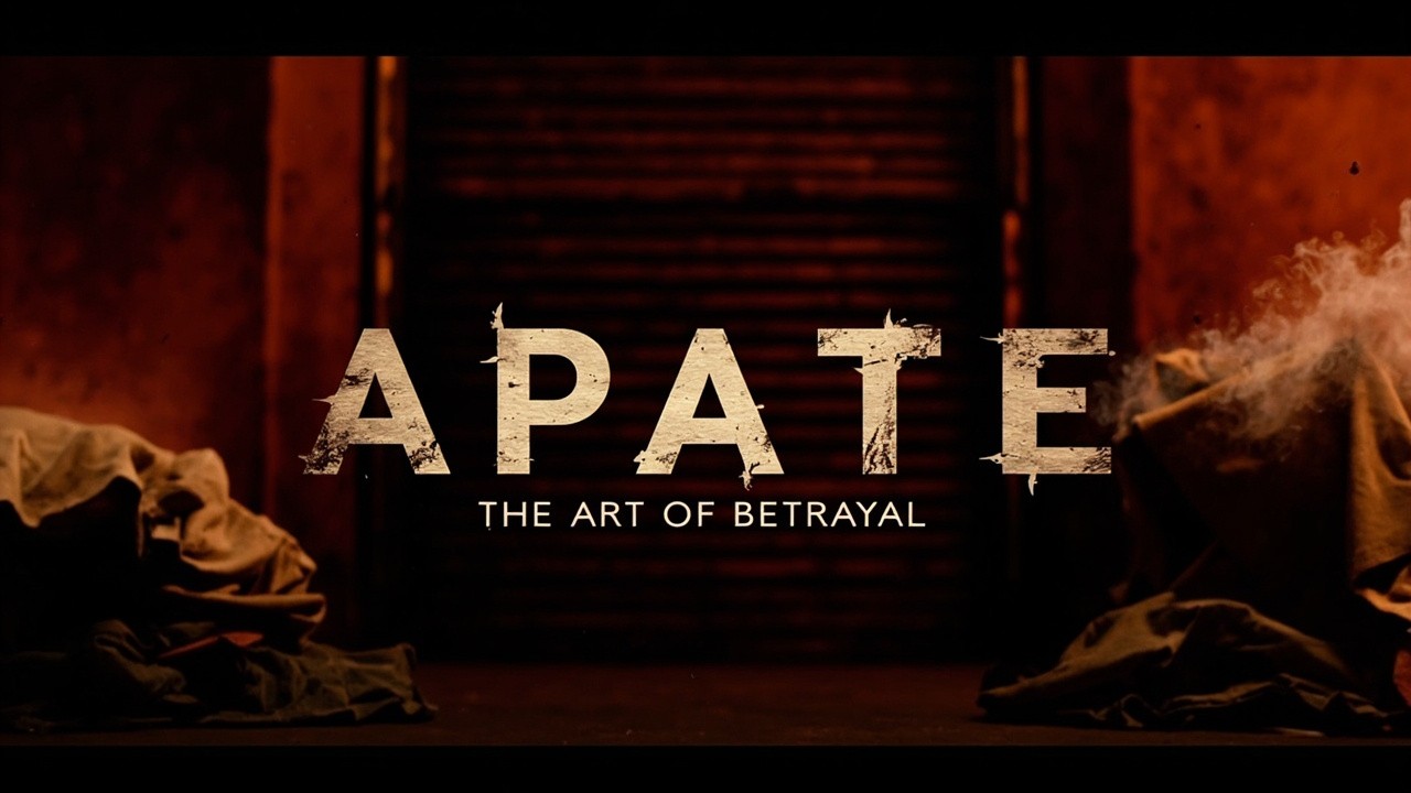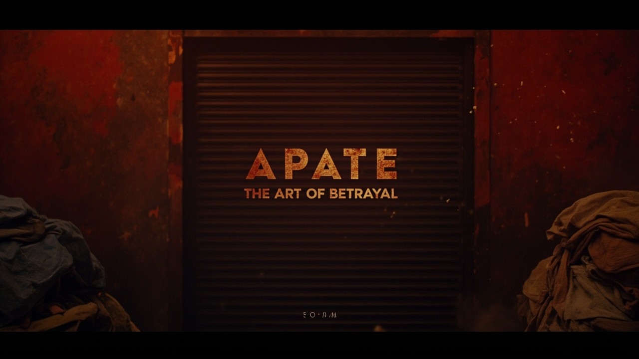 Create A cinematic titling motion graphics sequence. The words 'APATE' and the subtitle 'THE ART OF BETRAYAL' fade in and drift slowly toward the viewer in the center of the frame. Use the existing color palette of deep red, burnt orange, and charcoal black. The background should feature the abstract, add pile of cloths covered with a cloth to the bth left and right side and add a rusty metal shutter door which close from top to bottom fastly. Maintain a clean, professional film-opener aesthetic without any characters or human figures. Use distressed, stencil style sans serif for the word APATE and add some dust particles and subtle smoke to add more depth to the motion. Use top lift to highlight the title. Add slow motion once the title is fully shown or settled.