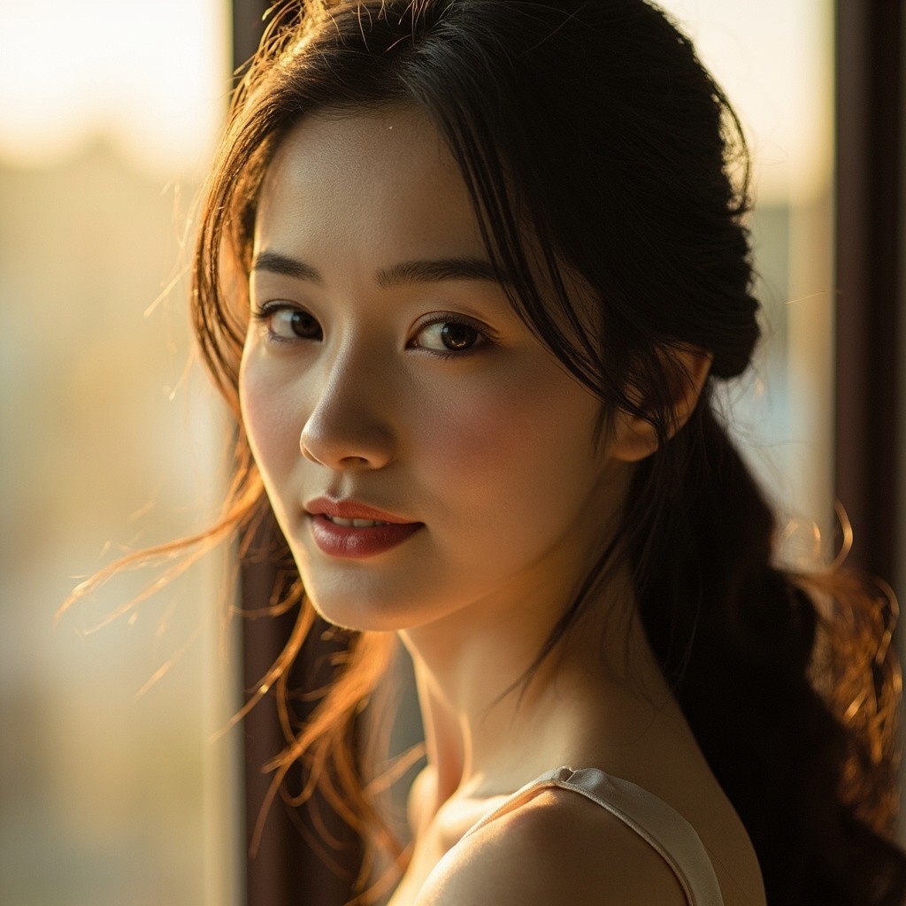 photorealistic, high detail photo of a beautiful Chinese woman, early 20s, delicate East Asian features, long dark black hair, warm smile, looking at viewer, soft window lighting, golden hour backlight, creating a gentle rim light on her hair, flawless realistic skin texture, slight blush, wearing a simple silk dress, close-up headshot, shot on DSLR, 85mm, masterpiece, best quality