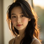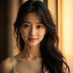 Chinese Woman with Long Black Hair Smiling in Golden Hour Lighting