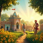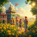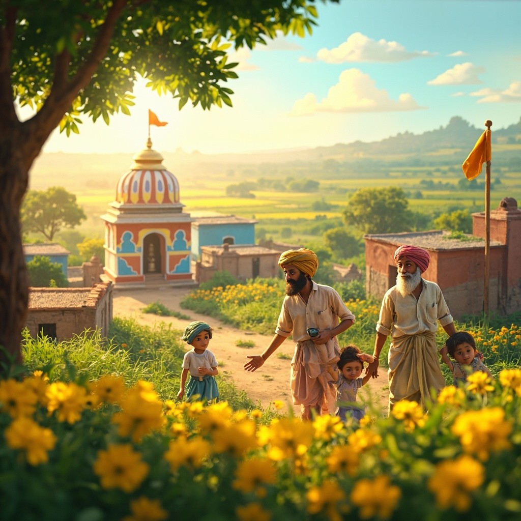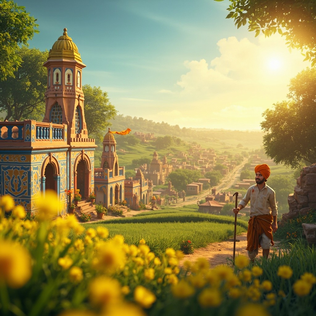 गांव का नज़ारा: सोनपुर एक बहुत ही सुंदर और खुशहाल गांव दिखेगा। घर मिट्टी के बने हैं लेकिन उन पर नीले, पीले और टेराकोटा रंग का सुंदर लेप है। दीवारों पर सफेद रंग से लोक-कला (Mandana) की पेंटिंग बनी हुई है। खेत और हरियाली: गांव के चारों तरफ लहलहाते हुए गेहूं के हरे खेत और सरसों के पीले फूल हैं, जो पूरे दृश्य को रंगों से भर देते हैं। मंदिर की घंटी: गांव के बीचों-बीच एक प्यारा सा मंदिर है जिसकी पीतल की बड़ी सी घंटी चमक रही है। सुबह की ताजी हवा में मंदिर का केसरिया झंडा लहरा रहा है। खुशहाल किसान: किसान पारंपरिक धोती-कुर्ते और रंगीन पगड़ी पहने हुए हैं।[1][2][3] उनके चेहरे पर बड़ी सी मुस्कान और आंखों में चमक है, जिससे पूरा माहौल सकारात्मक लगता है। Pixar स्टाइल की रोशनी: सूरज की पहली किरणें पेड़ों के बीच से छनकर आ रही हैं (God rays), जिससे गांव में एक जादुई और शांतिपूर्ण चमक है। सब कुछ बहुत साफ, गोल किनारों वाला और "Cute" 3D लुक में है