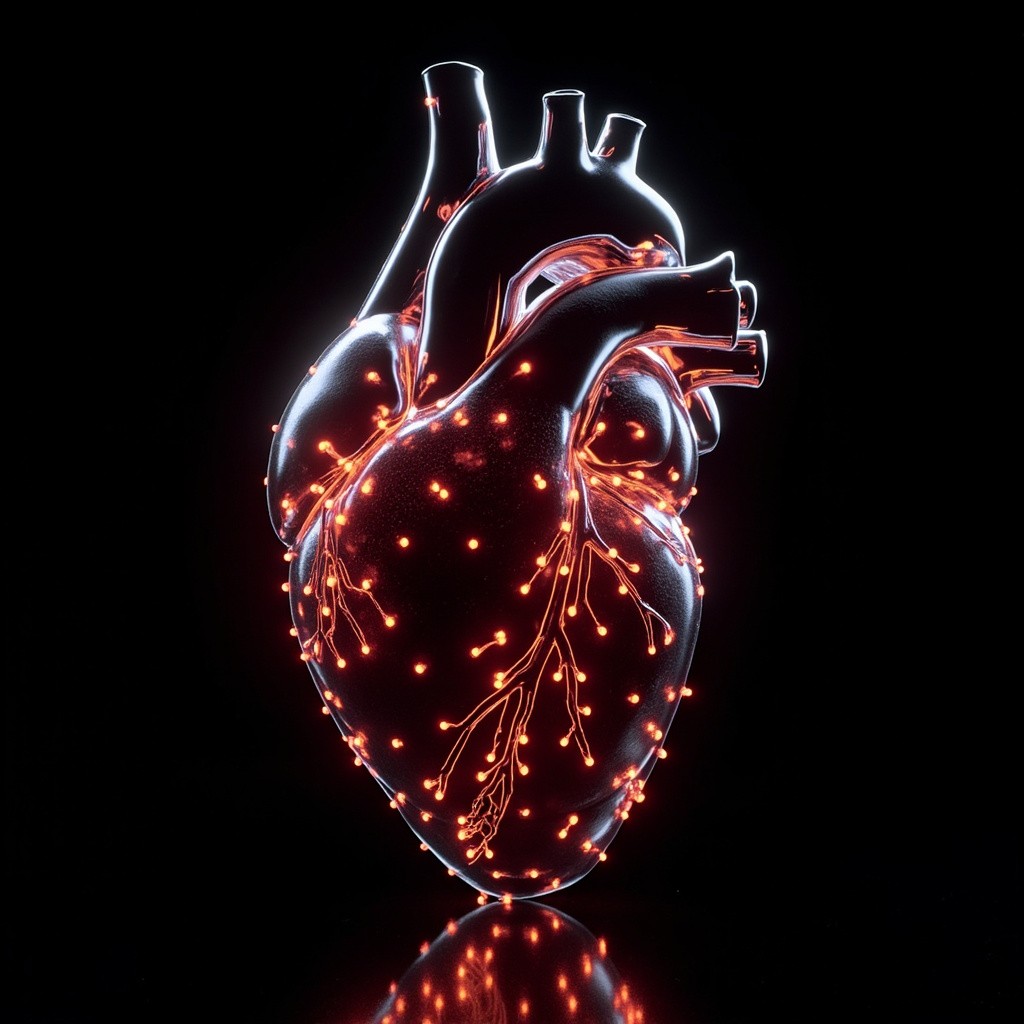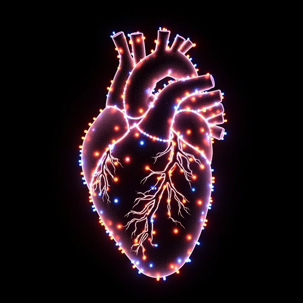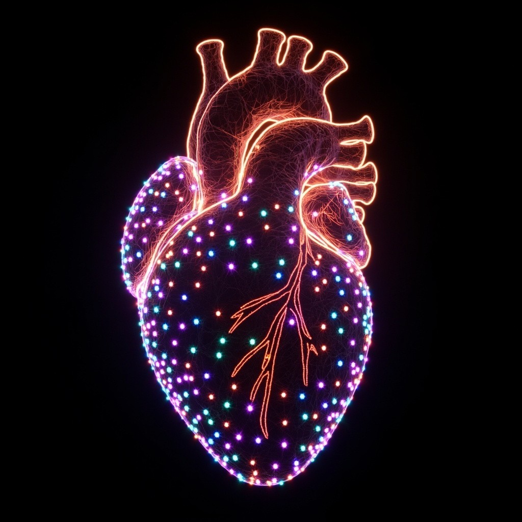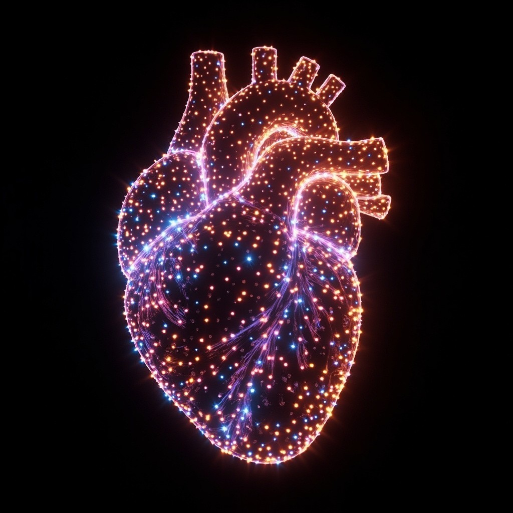 a human heart made of glowing LED dots and digital particles, bioluminescent point cloud, futuristic light sculpture, hyper-detailed, 3D render, vibrant colors on a black background, synthetic texture, soft glow, high contrast, volumetric lighting