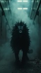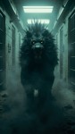 Cinematographic shot, in a cold, sterile prison corridor stands an elegant, powerful mythological creature on all fours, made of opaque black shadows with a regal mane and an expression of power and rage. Its color is intense black and its squinted eyes are fine and luminous. A black aura emanates from his entire body, resembling fumaroles of black energy. This is a very iconic creature, with a unique and powerful design. The scene is chaotic and poorly lit, ,motion effect, Ray of Light, directed by Steven Spielberg, realistic cloud, avant-garde, depth of field, microdetails, 8k,