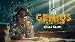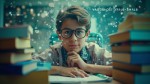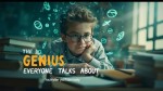 A genius-looking student sitting at a school desk, surrounded by glowing floating formulas, books stacked high, and a soft light focused on their thoughtful face. The background is a classroom with a dreamy, cinematic blur. The student has sharp eyes, wearing glasses, a slight smirk of confidence. Text on the image: “The Genius Everyone Talks About”. Make it bold, eye-catching, and YouTube-style.
